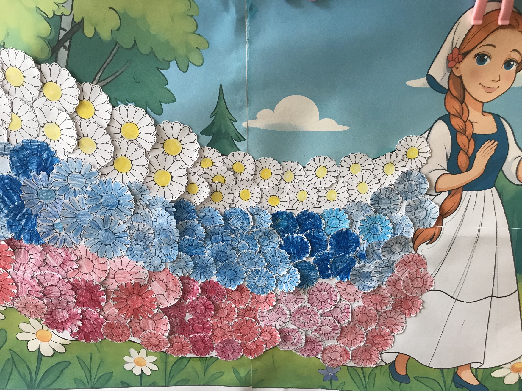 Ребята торжественно стоя послушали Гимн нашей страны, поучаствовали в игре « Собери ромашку», вспомнили официальные и неофициальные символы России, отгадывали загадки, читали стихи, подготовили коллективную работу:»Девушка Россия».