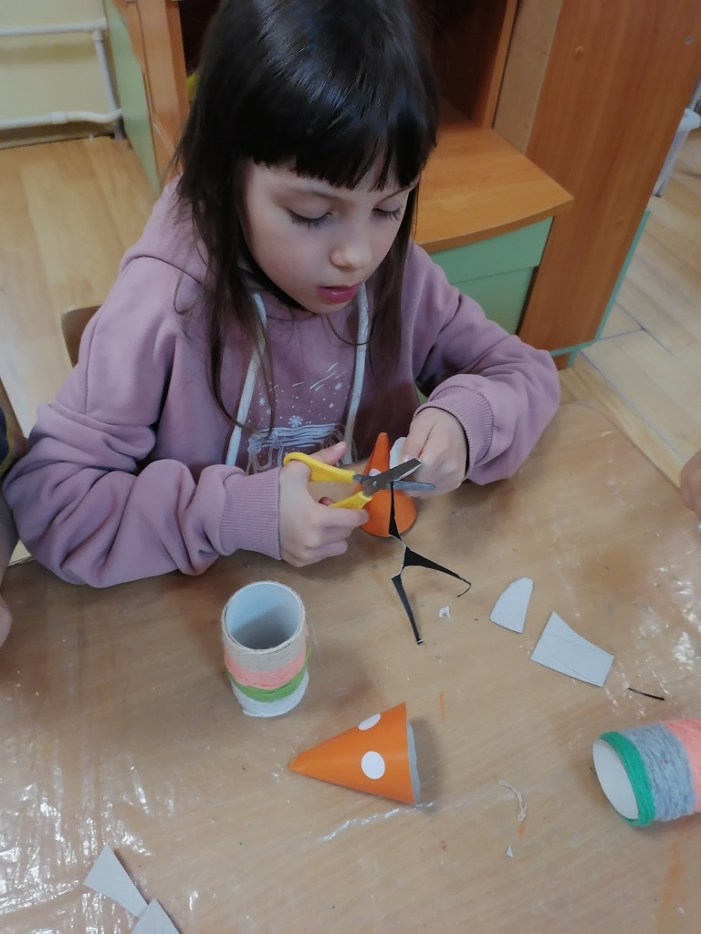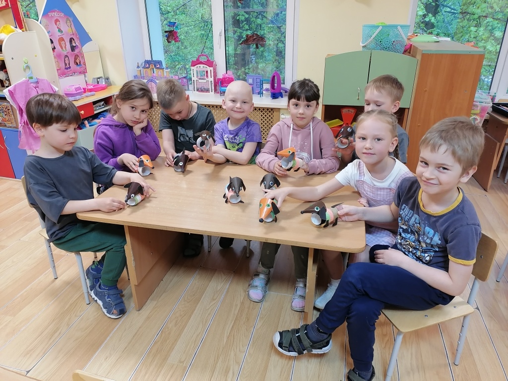Сегодня на занятии дети старшей группы "Умнички", смастерили из втулок, ниток и картона веселую собаку таксу. У каждой таксы появилось кличка, а чтобы она не замерзла на прогулке, ребята изготовили ей яркие, теплые жилеты.
