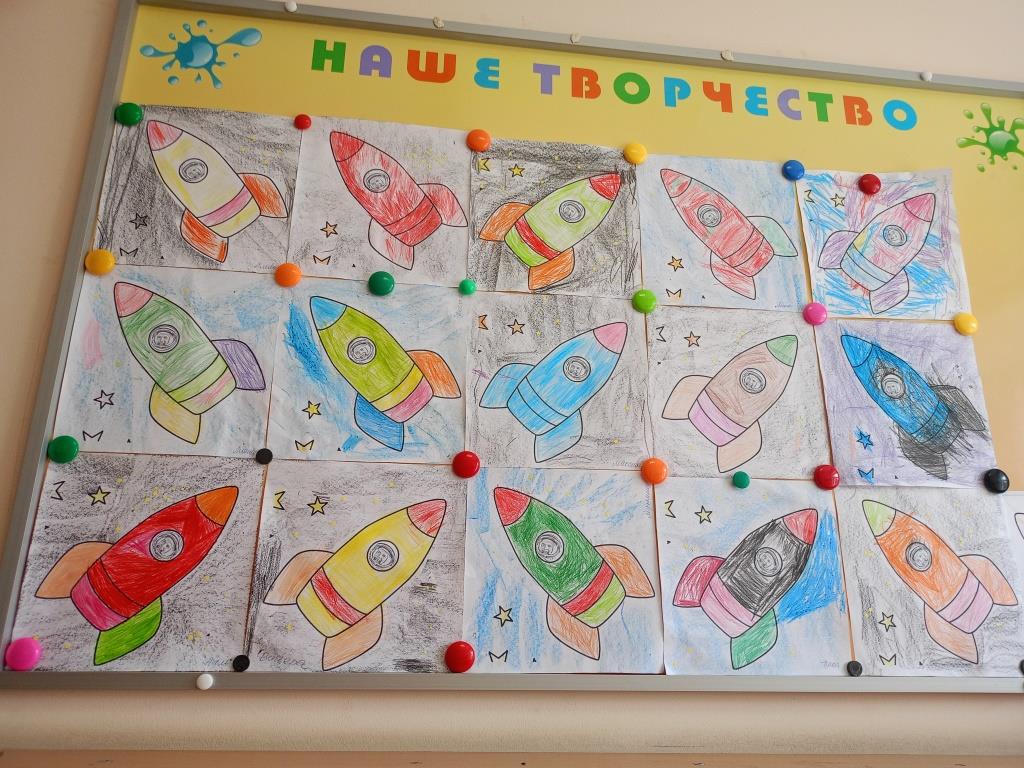 Для воспитанников младшей группы «Почемучки» в течение недели проводились тематические беседы: «Планеты солнечной системы», «Наша вселенная», «Кто такие космонавты», «Звездное небо - строение солнечной системы», «Животные в космосе», «Юрий Гагарин - первый космонавт». Дети рассматривали фотографии альбома «Космос», рисовали.Ребята с удовольствием конструировали свои ракеты из блоков Дьенеша. Всей группой с удовольствием поиграли в словесные и дидактические игры «Посчитай ракеты», «Найди лишнее», «Найди свою планету». В группе оформлена красочная выставка рисунков и стенгазеты«Космос глазами детей», ребята с удовольствием разглядывают свои шедевры.