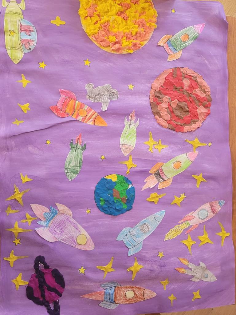 В рамках тематической недели в группе были проведены занятия и беседы, направленные на развитие познавательных и творческих способностей воспитанников. Эти занятия проходили через различные виды детской деятельности: чтение рассказов о космосе, планетах и космонавтах, рисование :»Космос -глазами детей», и аппликацию:»Космическая ракета»., а также через игру -пазлы:»Планеты солнечной системы», «Фазы Луны».