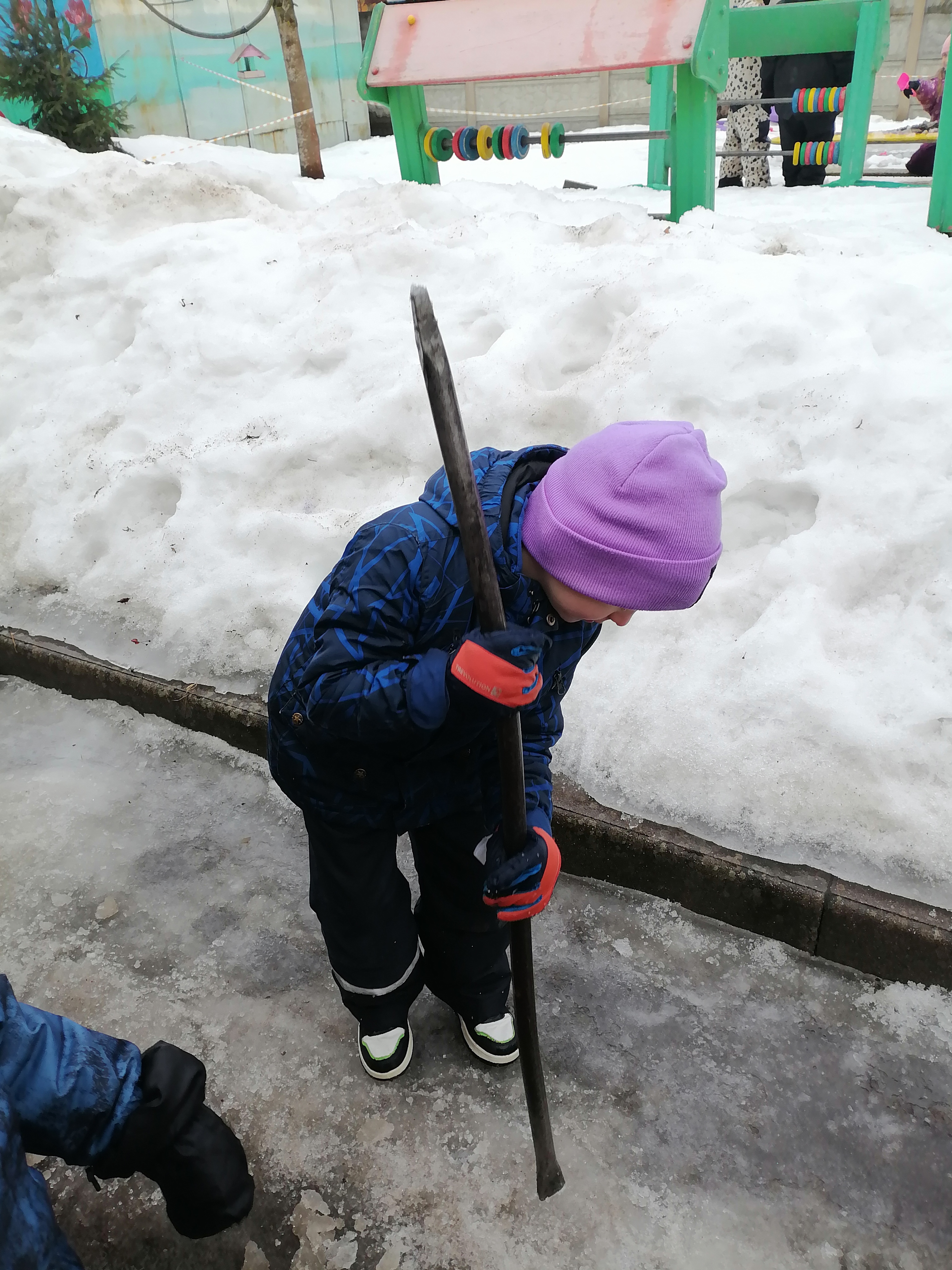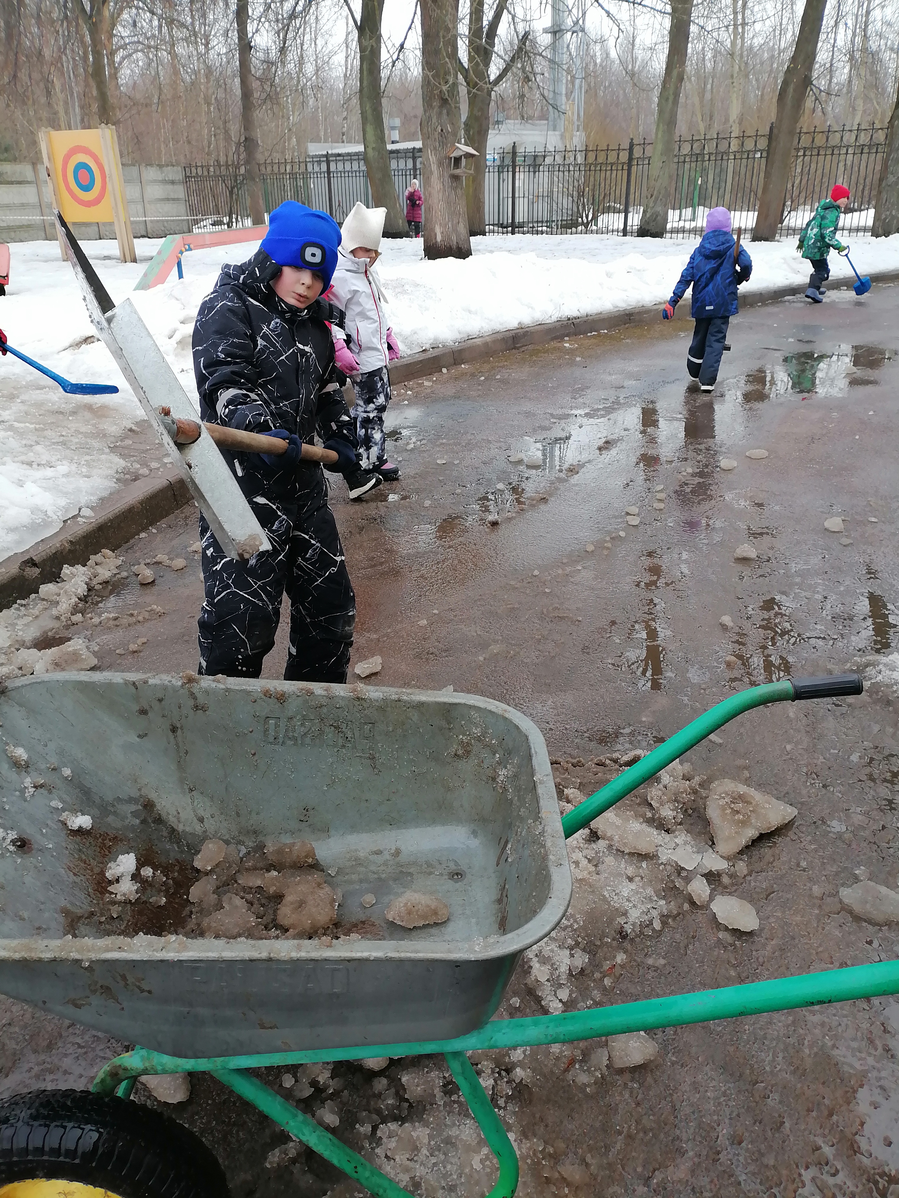 Ребята вооружились лопатами и даже использовали тачку. Работали дружно и старательно: чистили игровые зоны, сгребали оставшиеся участки снега, освобождали входы и тропинки.
