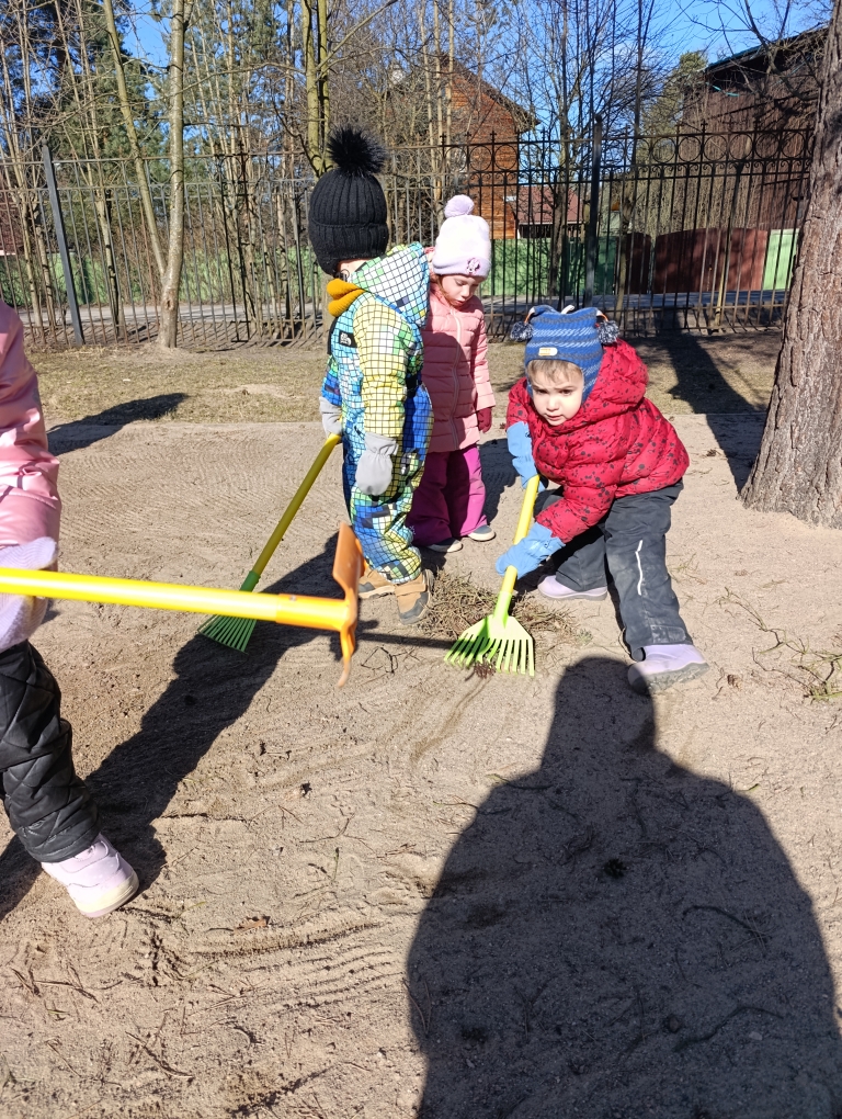 В этот прекрасный солнечный день детки убирали граблями участок: собирали опавшие ветки, шишки и сосновые иголочки. Наши малыши хоть и маленькие ещё, но очень любят трудиться, особенно наводить порядок.