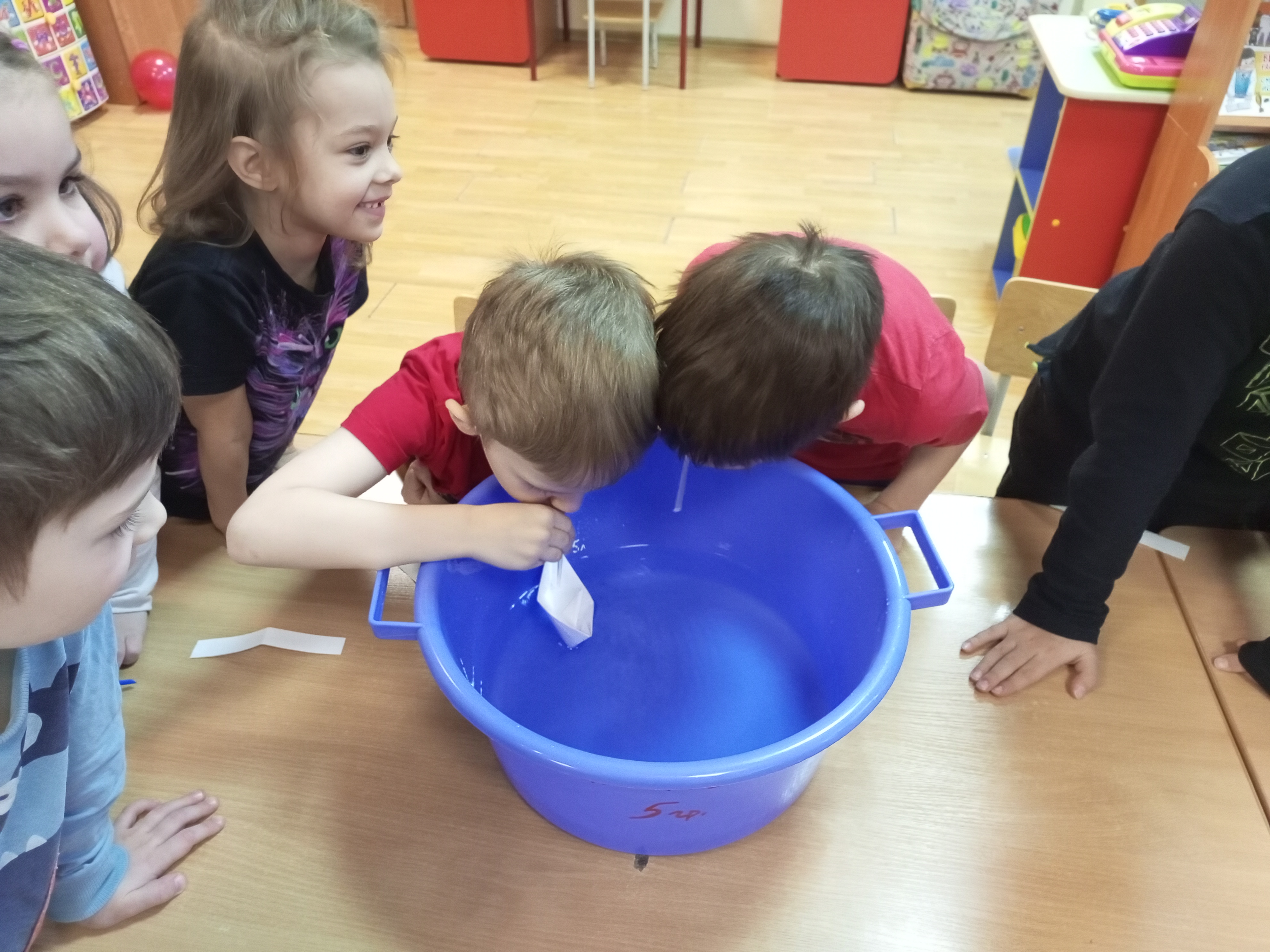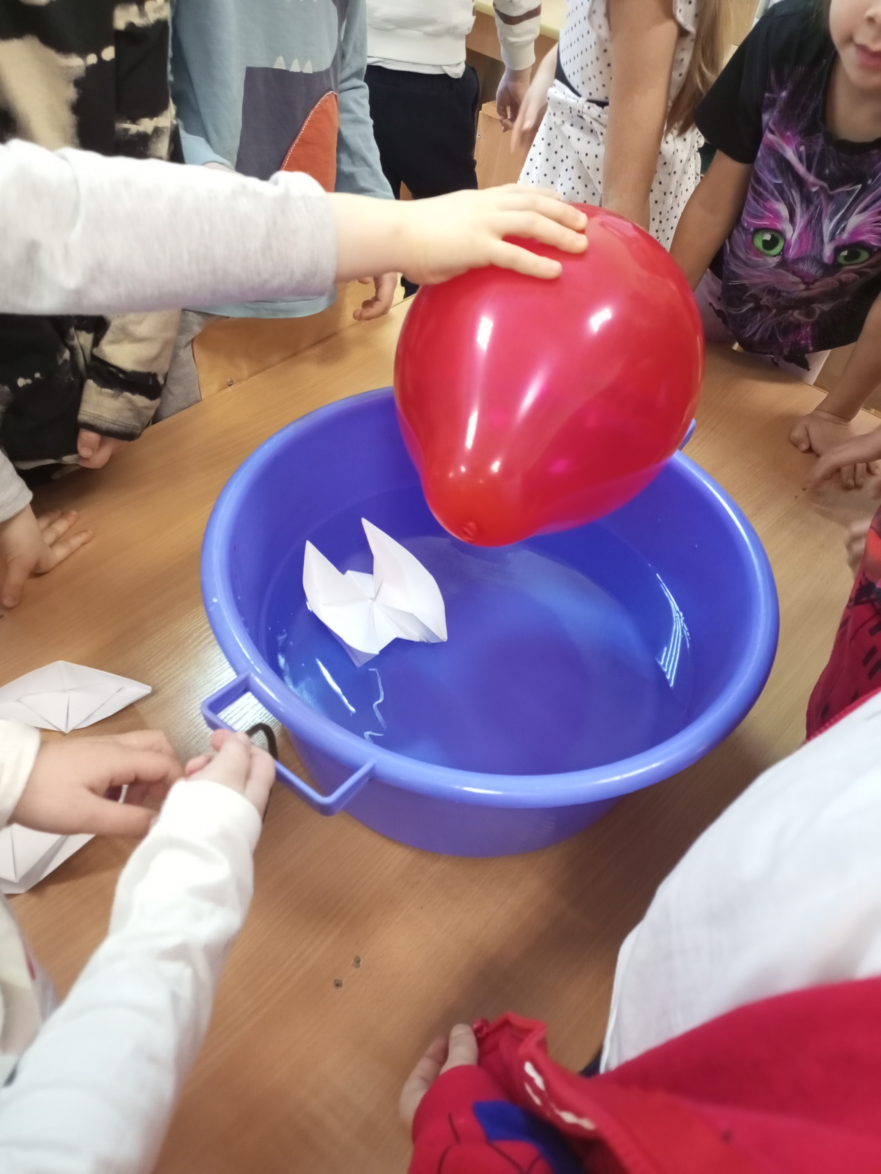 Занятие началось с обсуждения того, что такое воздух и как можно проверить, есть ли воздух вокруг нас. Для проверки детских гипотез были проведены опыты со стаканом и водой, с трубочками, с полосками бумаги и корабликом в воде.