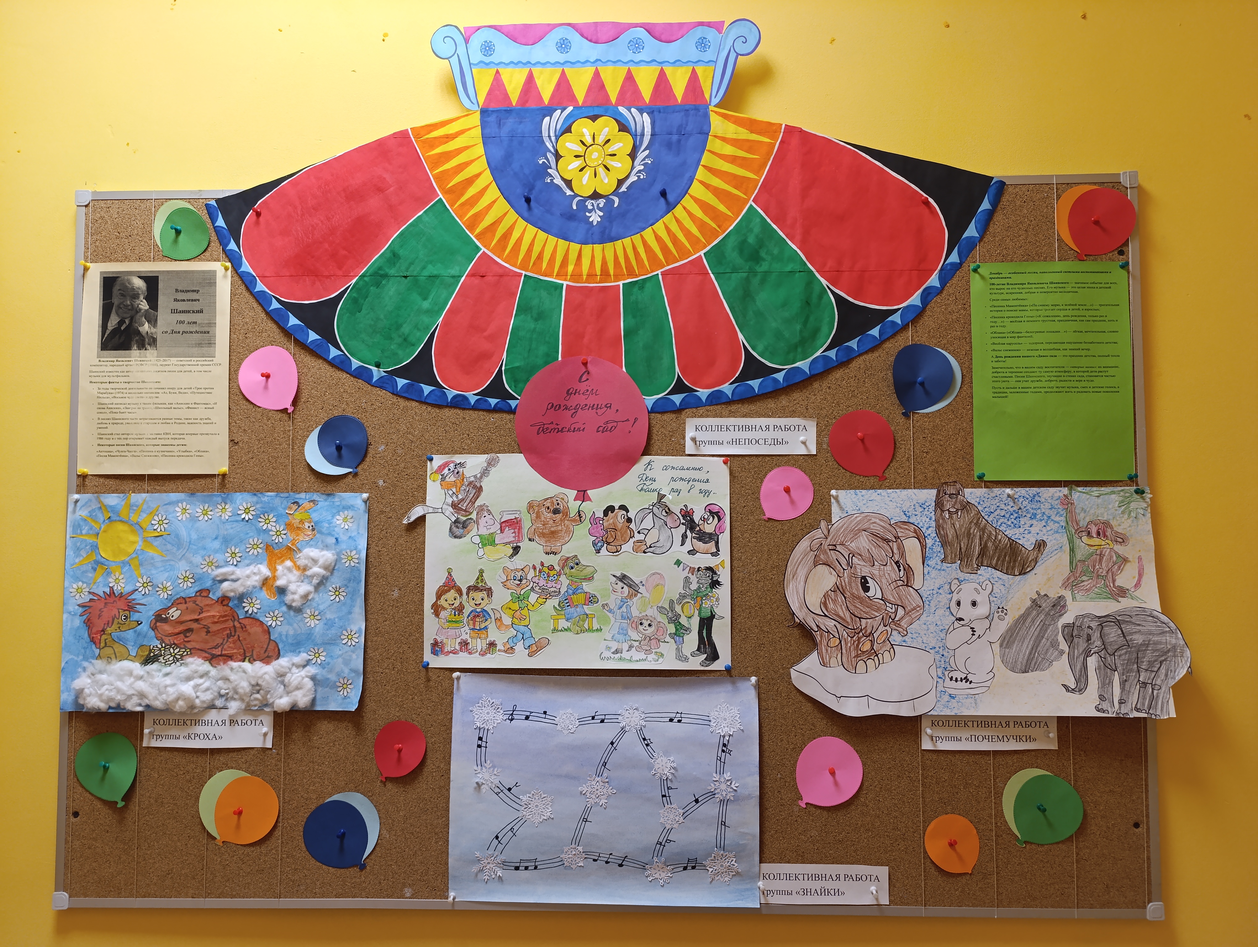 В честь этого замечательного композитора ребята подготовили особые творческие работы. Дети создали коллективные художественные композиции, вдохновлённые известными произведениями Шаинского. В процессе творчества воспитанники: