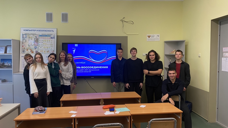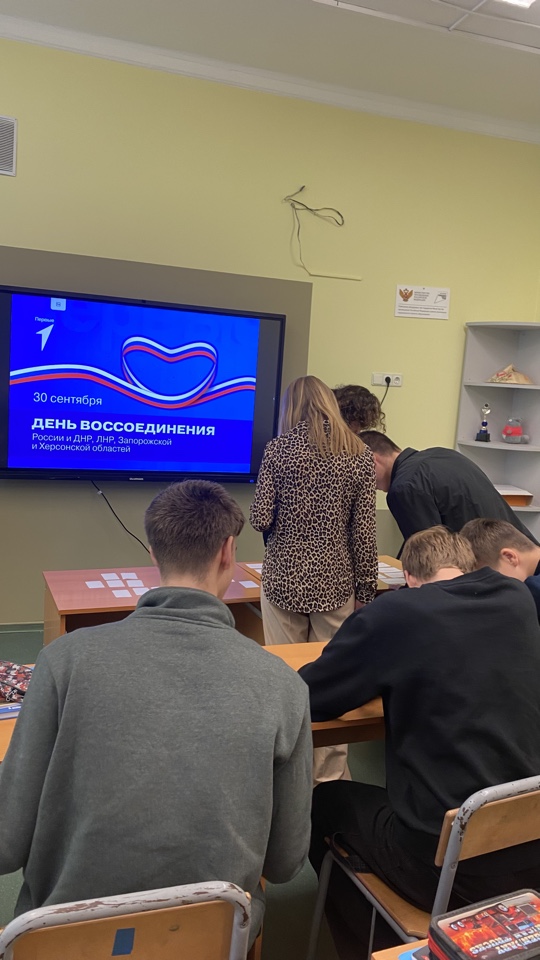 Сегодня, 30 сентября, состоялось наше внеурочное занятие «Разговоры о важном». Темой для обсуждения стало значимое событие – День воссоединения Донецкой и Луганской Народных Республик, а также Запорожской и Херсонеской областей с Российской Федерацией. Это важный день в нашей истории, и мы начали наш разговор именно с этого события.