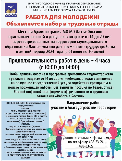 Местная Администрация МО МО Лахта-Ольгино приглашает на временное трудоустройство несовершеннолетних в возрасте от 14 до 18 лет в свободное от учебы время, безработных граждан, испытывающих трудности в поиске работы, безработных граждан в возрасте от 18 до 20 лет, имеющих среднее профессиональное образование и ищущих работу впервые, зарегистрированных на территории МО Лахта-Ольгино, в летний период 2024 года (с 01 июля по 30 июля).