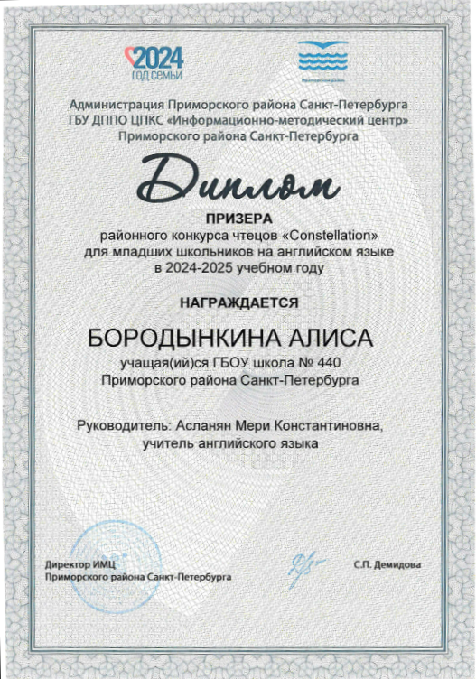 ✅ Обучающаяся 3а класса Бородынкина Алиса стала *Призёром* районного конкурса чтецов на английском языке для младших школьников «Constellation» .