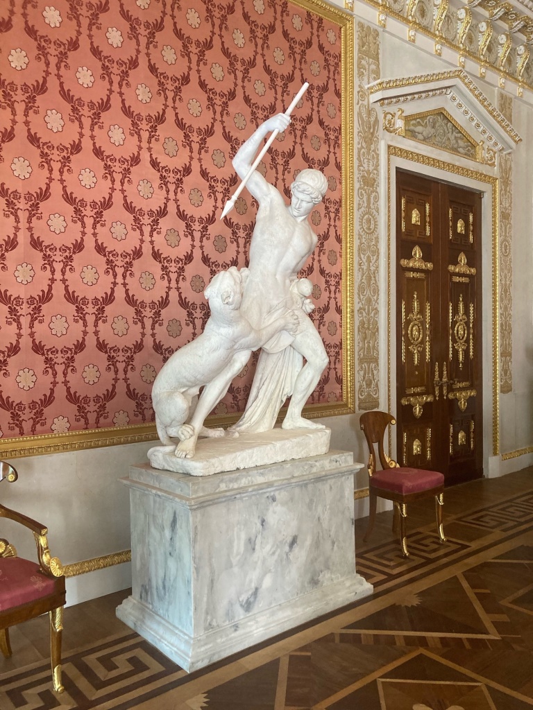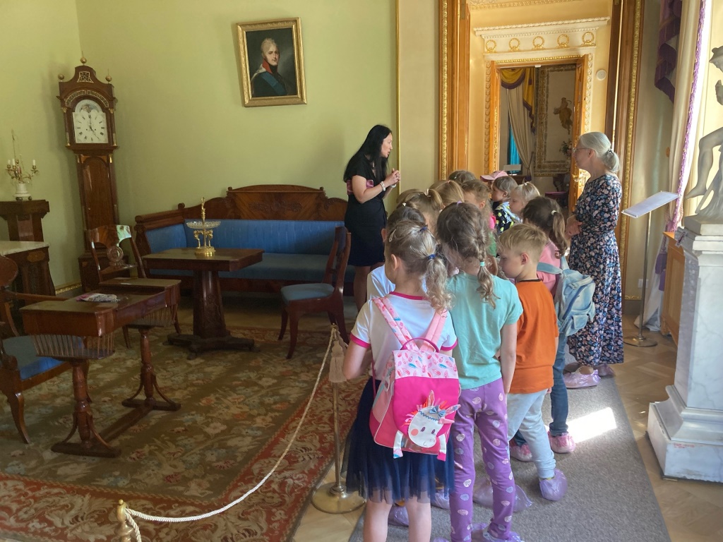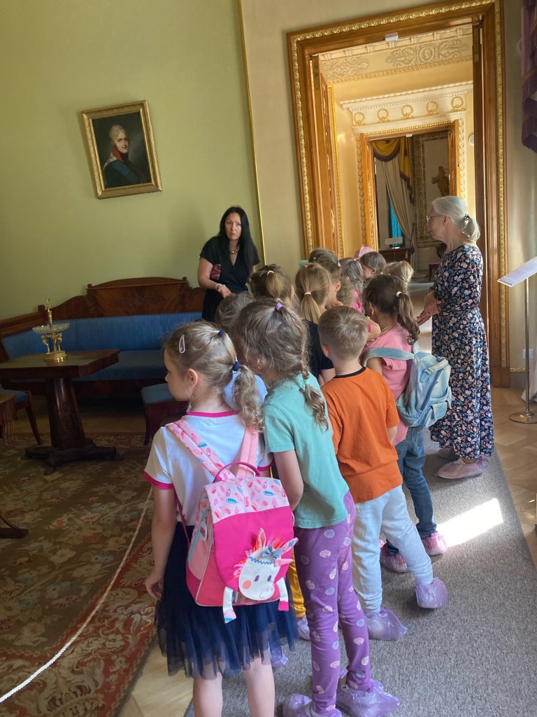 Словно белая лилия среди Невских волн, на пути появился прекрасный дворец, окруженный садом, оранжереями, кухонным и конюшенным корпусами и строениями для фрейлин и слуг. Попав на экскурсию по залам дворца, дети поражались изяществу и роскоши убранства. Сам дворец задумывался как летняя резиденция царской семьи. Особой гордостью музея является постоянная экспозиция – «Парадные залы Елагиноостровского дворца», представляющая интерьеры, созданные по проекту К.И.Росси. Их отделка, от росписей плафонов до рисунка дверных ручек, включая люстры, мебель, декоративное убранство окон и дверей – все было выполнено по его эскизам. Уникальность экспозиции в том, что интерьеры дворца с момента его создания не перепланировались и были воссозданы в том виде, какими их задумал великий зодчий.