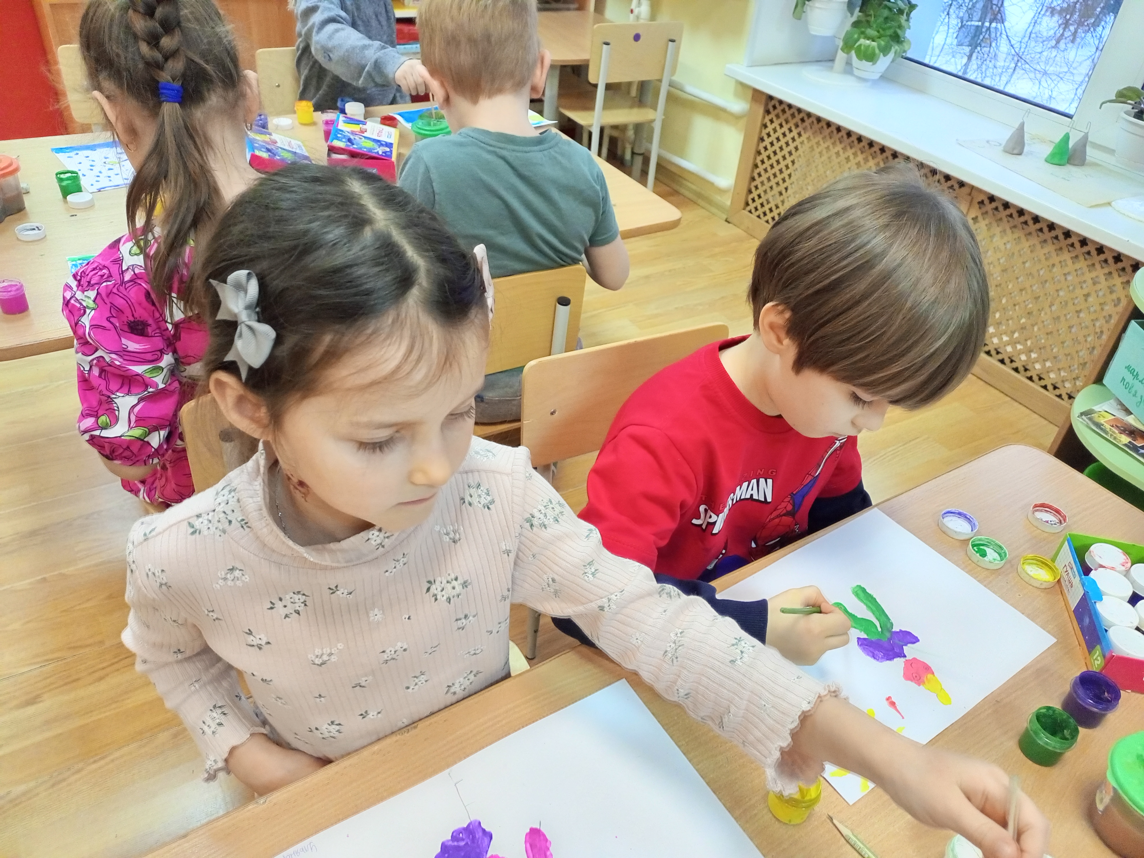 На занятии ребята аккуратно раскрасили заготовки из бумаги, стараясь передать в рисунке красоту зимней природы. Дети учились аккуратно вырезать детали ножницами. Воспитатель объяснял технику безопасности при работе с инструментом и помогал тем детям, у кого возникали трудности.