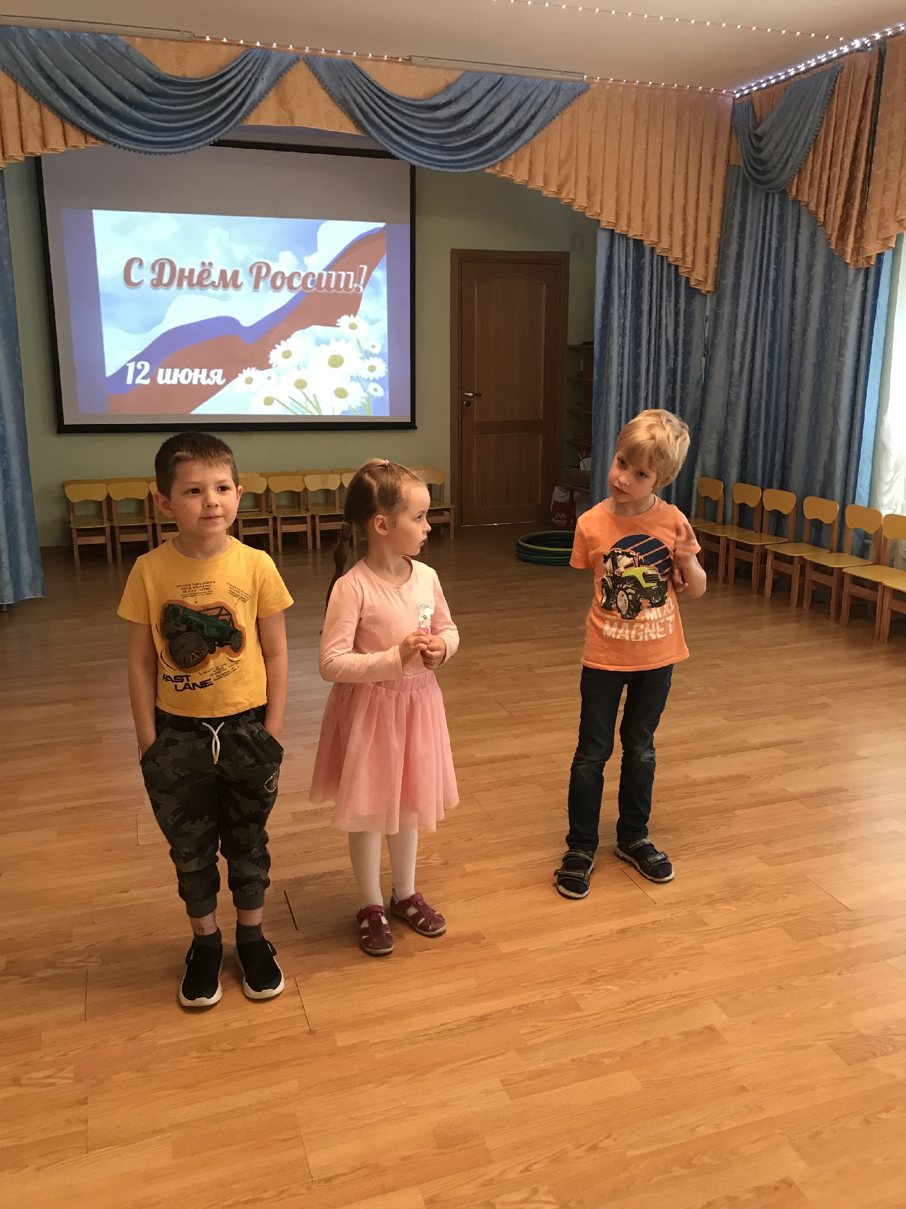 Накануне Дня России в подготовительной группе прошел тематический день, посвященный этому событию. Целью этого мероприятия было формирование у детей представлений о России как о государстве, о родной стране, воспитание чувства любви к Родине.