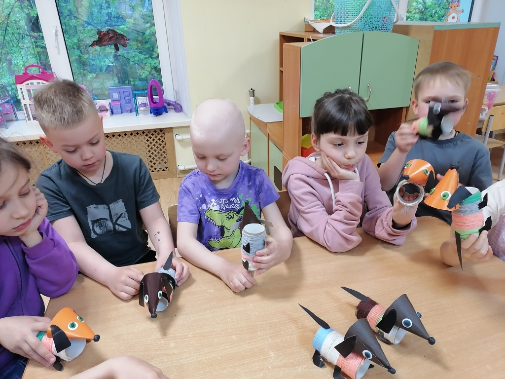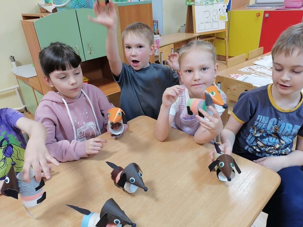 Сегодня на занятии дети старшей группы "Умнички", смастерили из втулок, ниток и картона веселую собаку таксу. У каждой таксы появилось кличка, а чтобы она не замерзла на прогулке, ребята изготовили ей яркие, теплые жилеты.