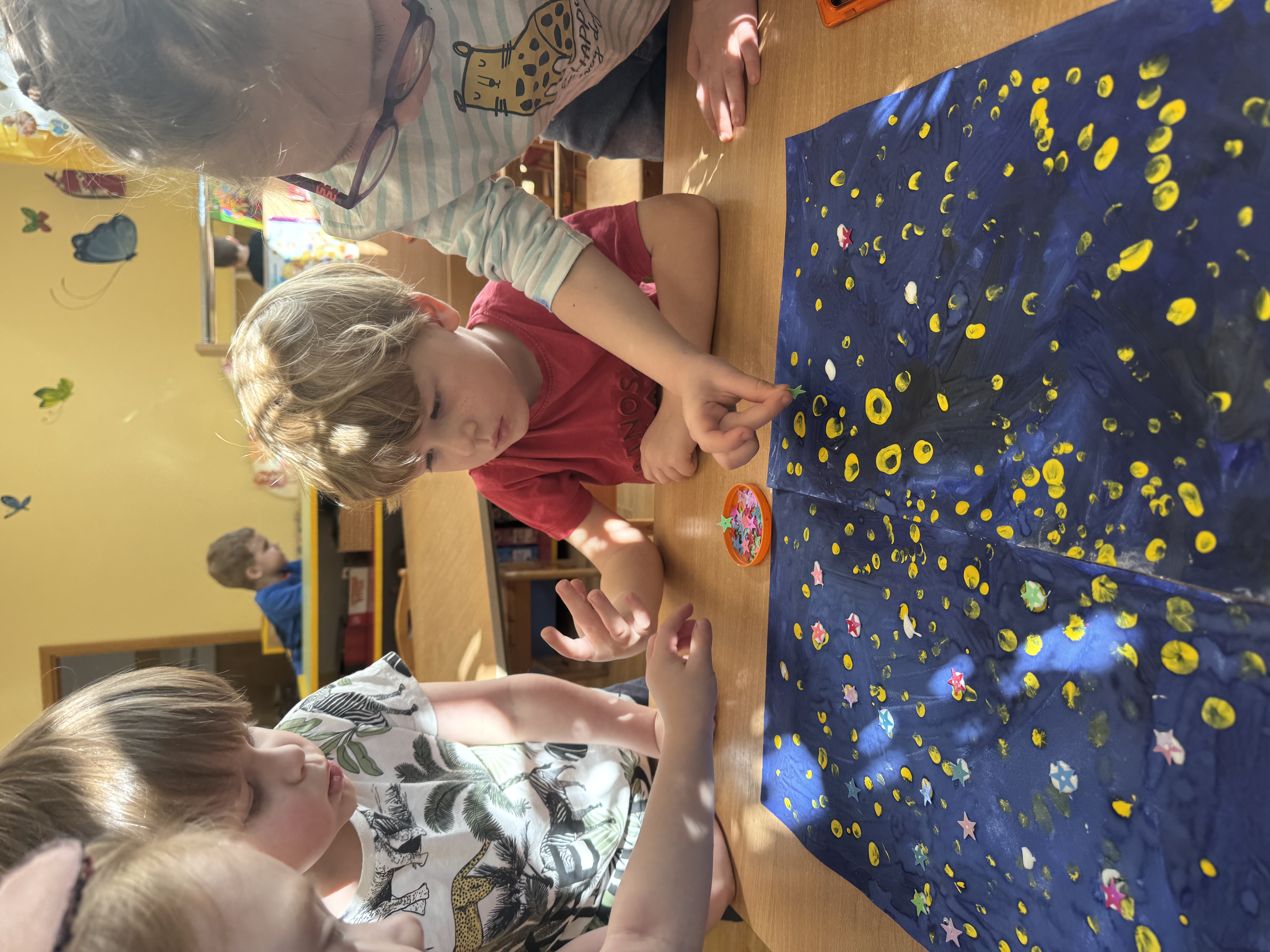 Итоговым занятием стало выполнение коллективных работ «Звездное небо» и «Космическое путешествие». Тематическая неделя прошла в младшей группе познавательно и интересно.