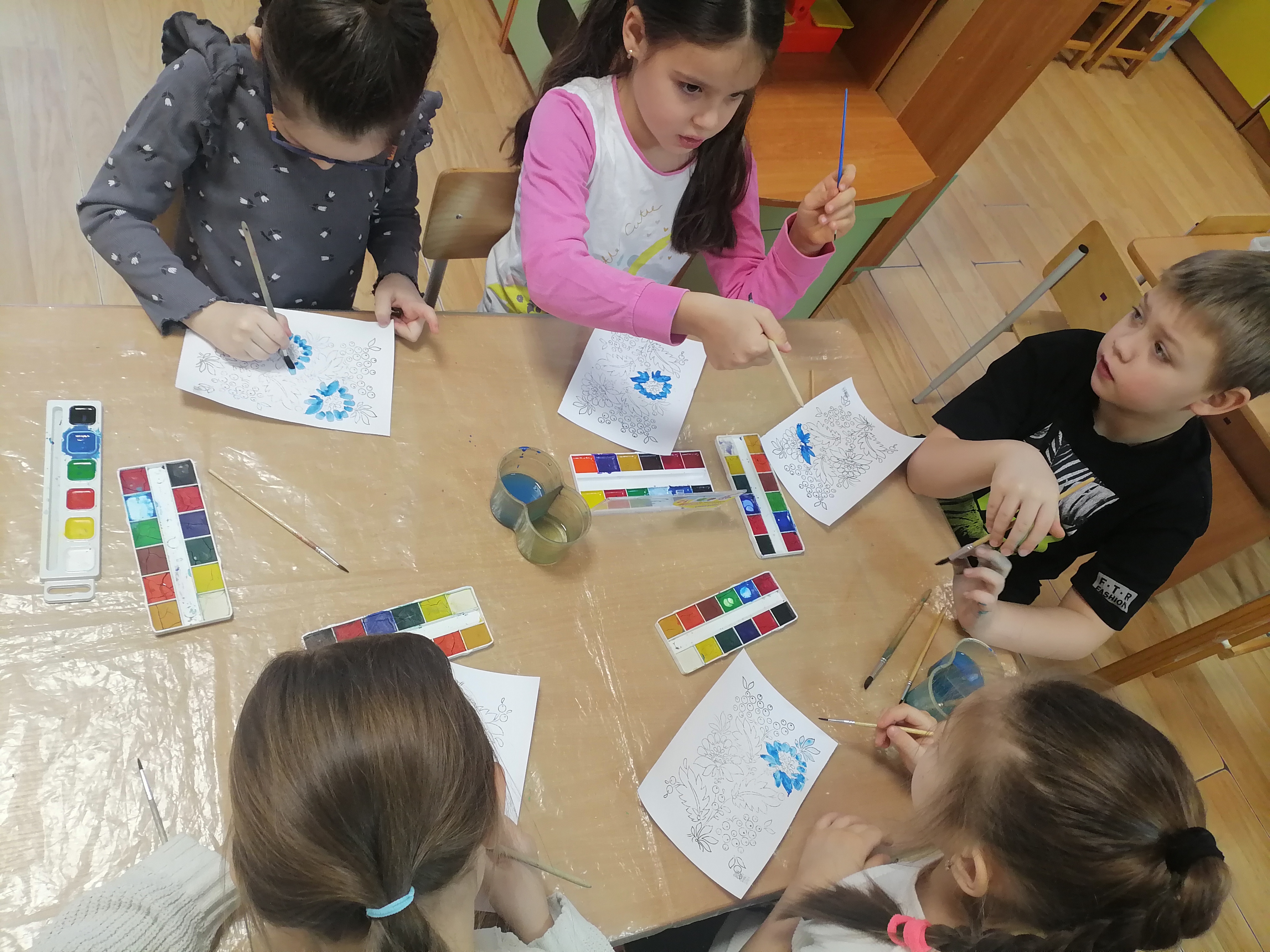 Затем наступила самая захватывающая часть занятия – создание собственных произведений искусства. Каждый ребенок получил белый хлопковый платочек и краски. Воспитанники проявляли свою фантазию, стараясь повторить характерные элементы гжельского стиля: изящные лепестки цветов, завитки листьев и плавные линии узора.