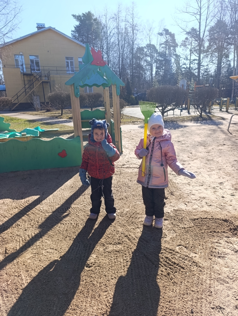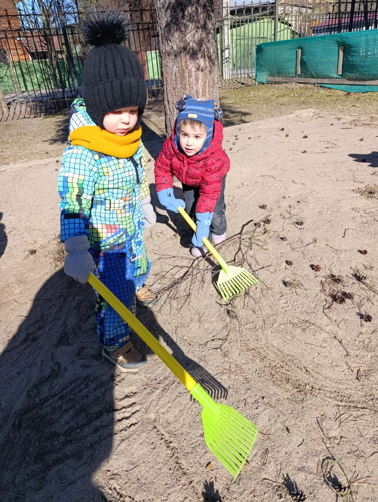 В этот прекрасный солнечный день детки убирали граблями участок: собирали опавшие ветки, шишки и сосновые иголочки. Наши малыши хоть и маленькие ещё, но очень любят трудиться, особенно наводить порядок.
